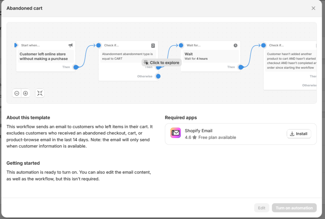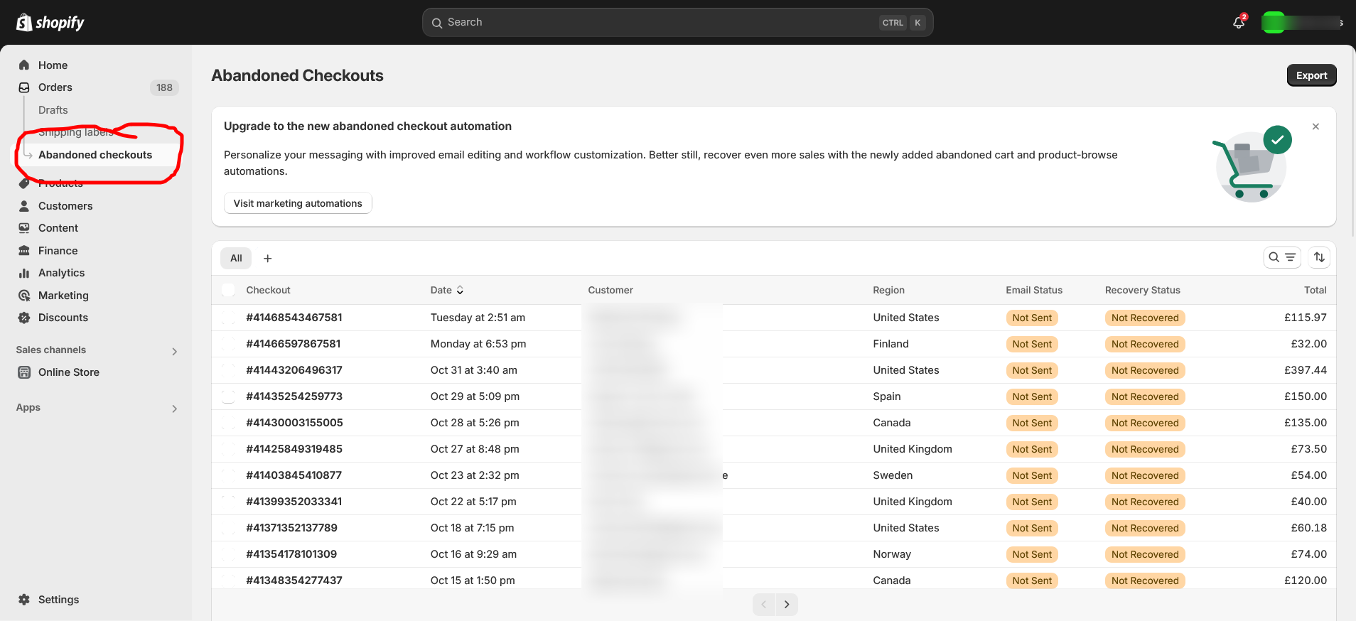 Luckily, most platforms automate the process for you so it is as simple as switching on the automation. In shopify go to - marketing- automations and you will see two automations that you can preview that cover abandoned carts and also view abandonment.
