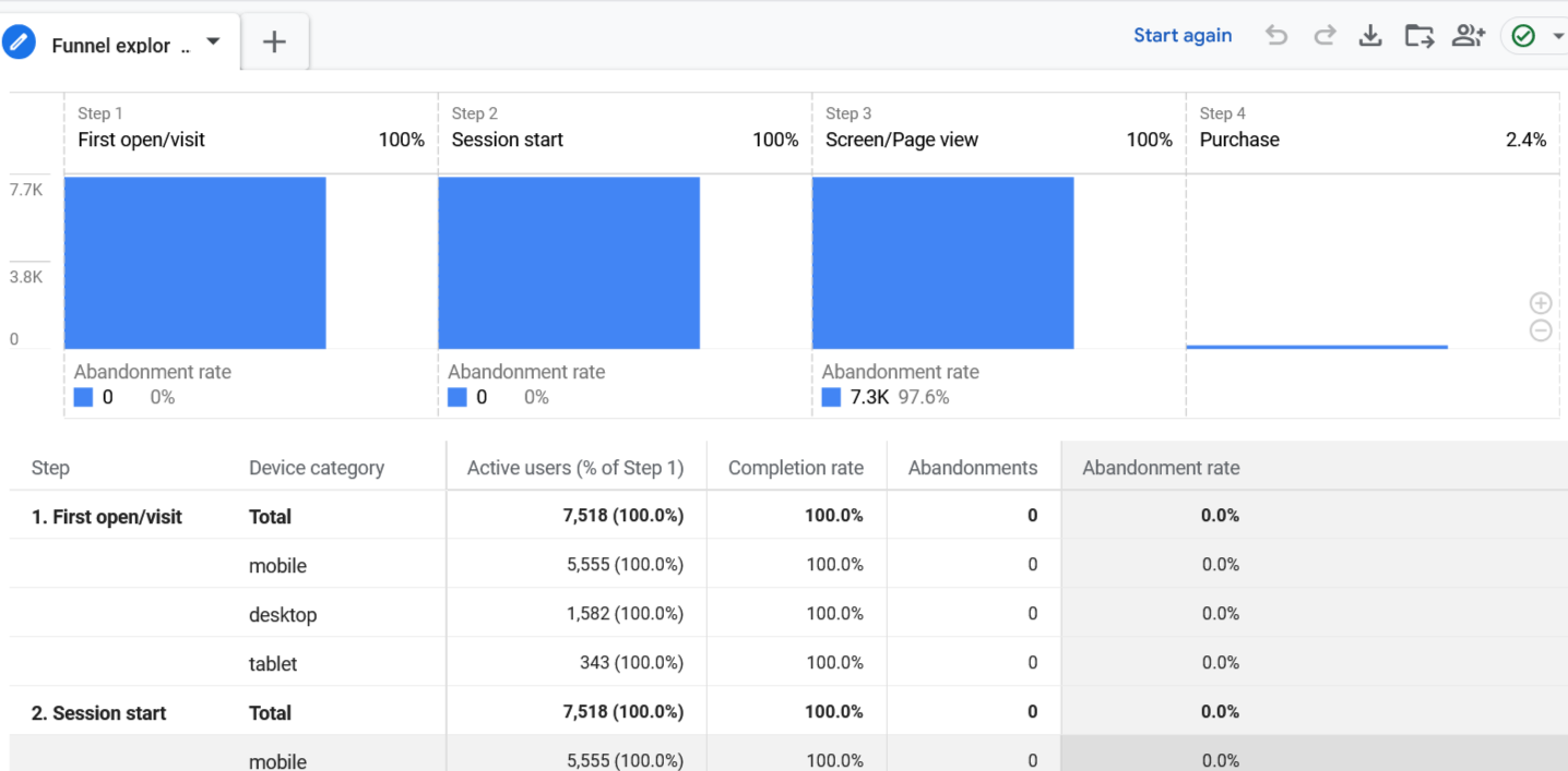 There are many useful tools in GA4, including reports where you can find the abandonment rate. As you can see below, 97.6% of all users that do not check out and 2.4% that successfully purchase.