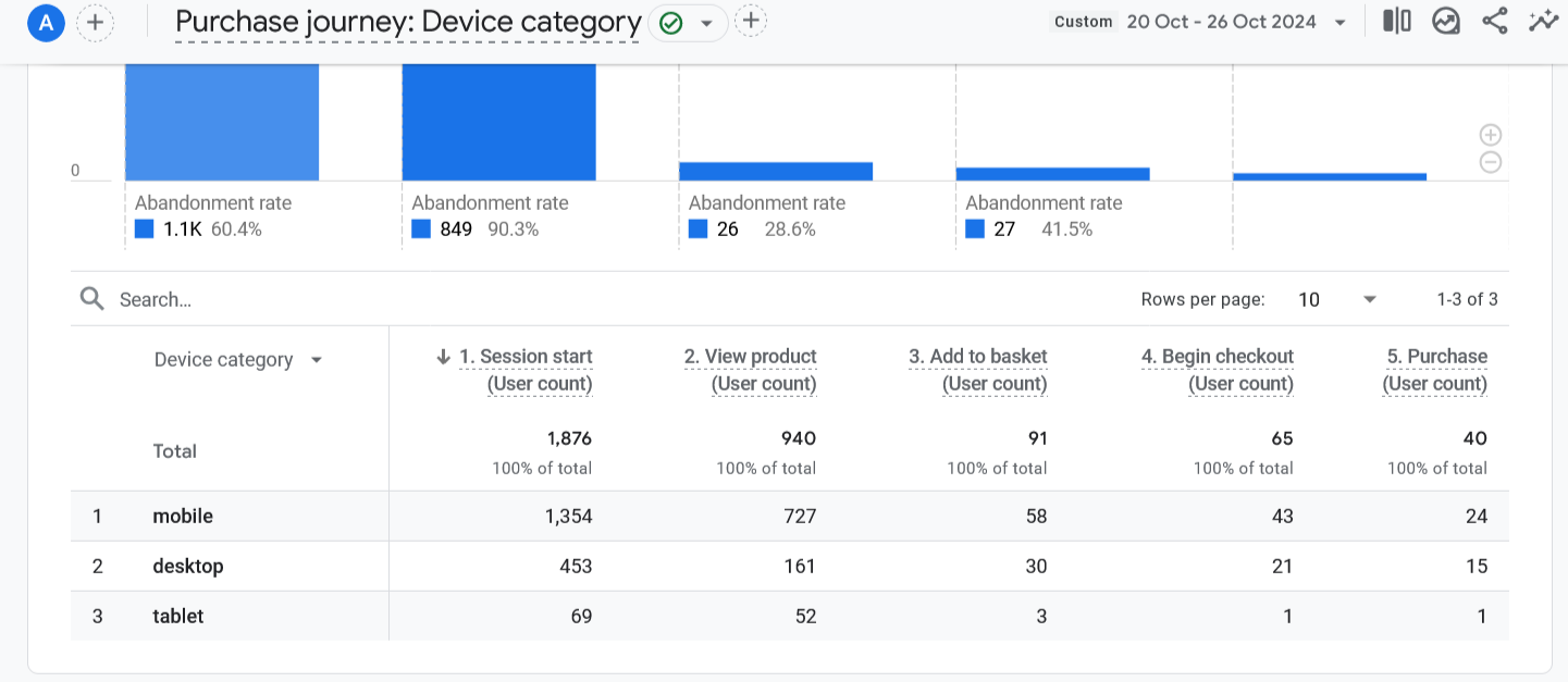The majority of ecommerce platforms have an abandoned cart email you can switch on at the very minimum. If you use your store data as well as GA4 and Google Search Console you can view reports as you can see below which show you how many people are dropping off the website without purchasing.
